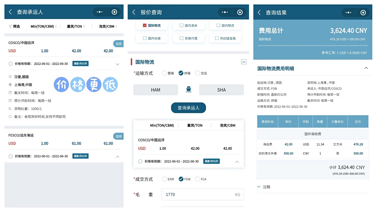 得到的报价为3624.40CNY,其中包含476.28CNY的海运费和500CNY的目的港文件费。这一报价为我们的真实报价,全程透明,承诺无任何隐形费用!